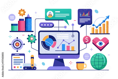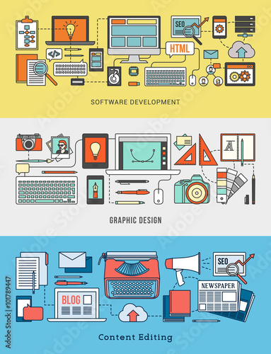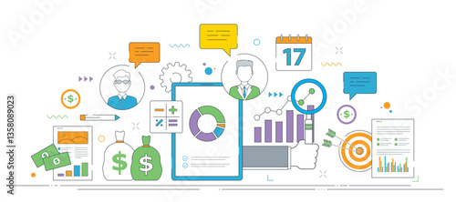 Business dashboard plakát banner šablona. Vector thin line art flat style design s kancelářskými pracovníky vtipné kreslené postavičky, obchodní symboly, ikony pro webové stránky bannery a tištěných materiálů.