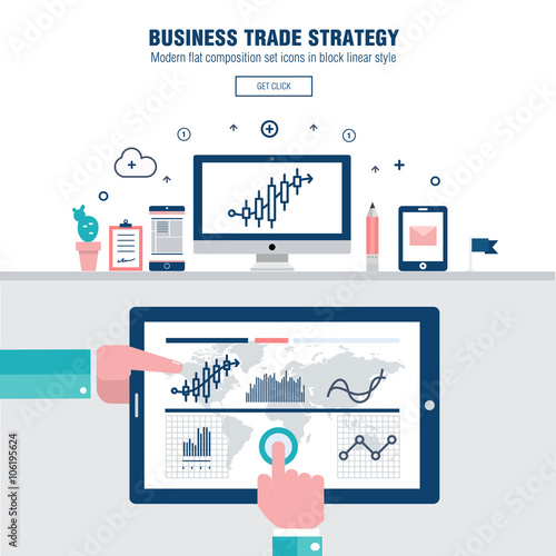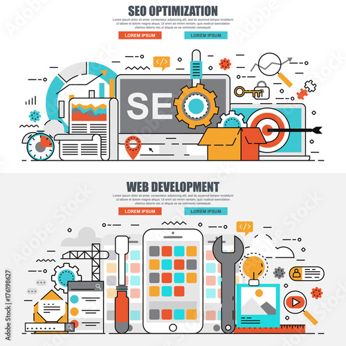 Vektorová sada strategických a technologických koncepčních bannerů. Moderní tenké linie ploché designové prvky, symboly a ikony pro web, marketing a tisk.