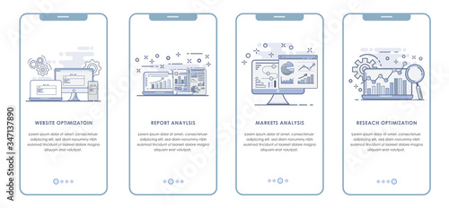 Vektorové sada vertikálních bannerů s tým, projekt, analýza, vývoj a seo koncept prvky. Tenké čáry ploché designové symboly, ikony pro nabídku webových stránek, tisk.
