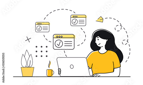 Vektorový webový vývoj, programovací koncept banner. Digitální zařízení, programátor vytvářející webové stránky, psaní počítačového softwaru, mobilní aplikace. Tenké čáry plochý design symboly a ikony pro web, tisk