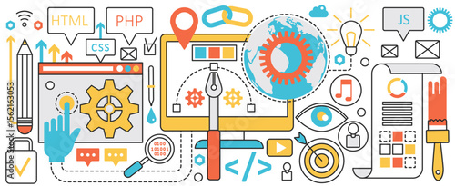 Hromadná média reklamní plakát banner šablona. Vektorové tenké čáry art ploché styl designové prvky, ikony pro webové stránky bannery a tiskovin.