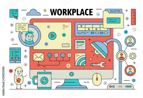Obchodní úspěch plakát banner šablona. Vector thin line art flat style design s kancelářskými pracovníky vtipné kreslené postavičky, obchodní symboly, ikony pro webové stránky bannery a tištěných materiálů.