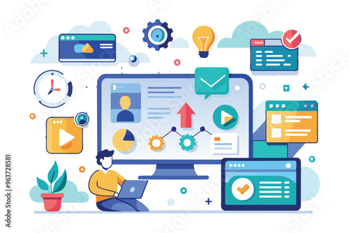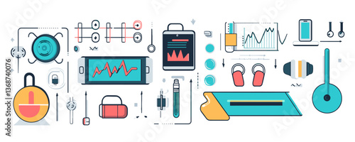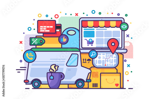 Office workplace plakát banner šablona. Vektorové tenké čáry umění plochý styl designové prvky, symboly, ikony pro webové stránky bannery a tištěných materiálů.
