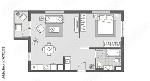 Vektorový pohled shora ilustrace moderního bytu s jednou ložnicí. Podrobný architektonický plán jídelny v kombinaci s kuchyní, koupelnou, ložnicí. Domácí interiér s pohodlným nábytkem.