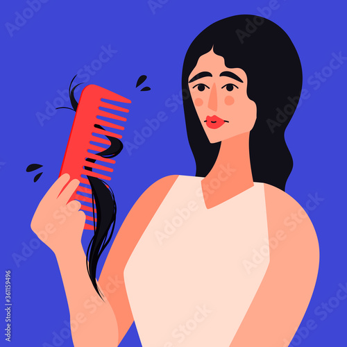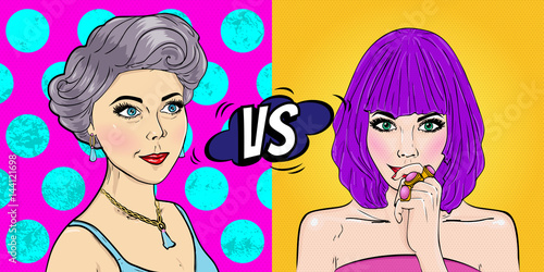 Vektor vintage holičství ad design šablony. Krásná žena kadeřnice s barvenými vlasy drží holičství pól v retro pop art komické stylu.