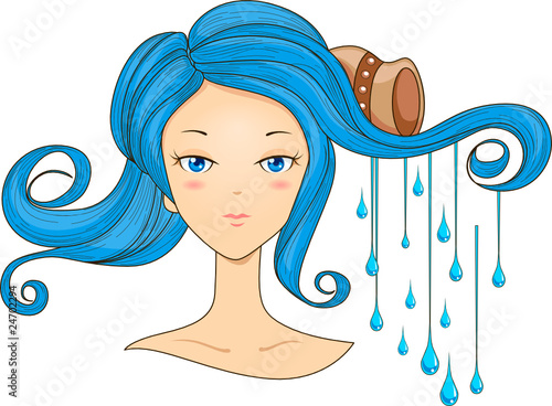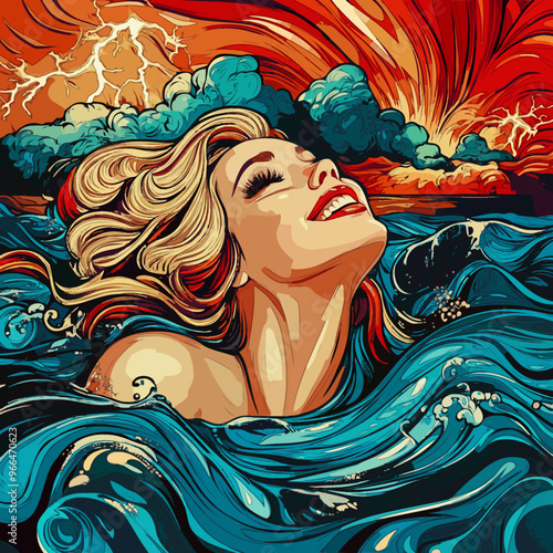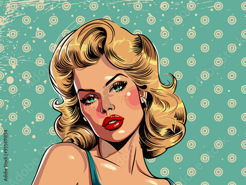 Vektorová ilustrace krásné ženy s dlouhými vlnitými vlasy a parfémy, vlasové výrobky, make-up kolem ní. Kosmetický salon nebo kadeřnický salon plakát v retro pop art komickém stylu.