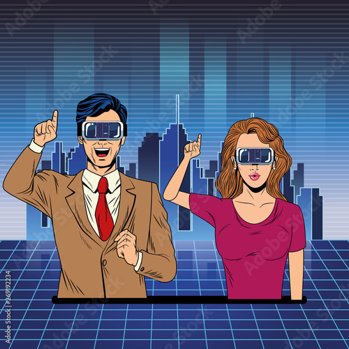 Vektorové ilustrace podnikatelka použití tablet, bubliny v retro pop art komiks styl.