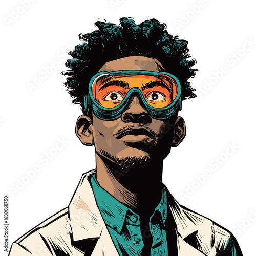 Vektorová ilustrace mladého chlapce v brýlích s ukazováčkem nahoru gesto, znamení ruky, myšlenková bublina v retro pop art komickém stylu.