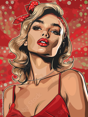 Vektorová ilustrace překvapené blonďaté ženy a nápisy na prodej. Slevy a prodejní reklamní plakát v retro pop art komiksovém stylu.