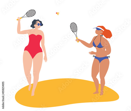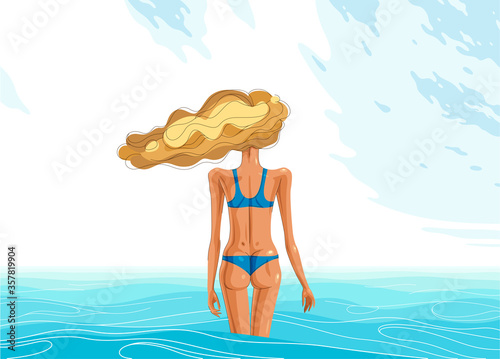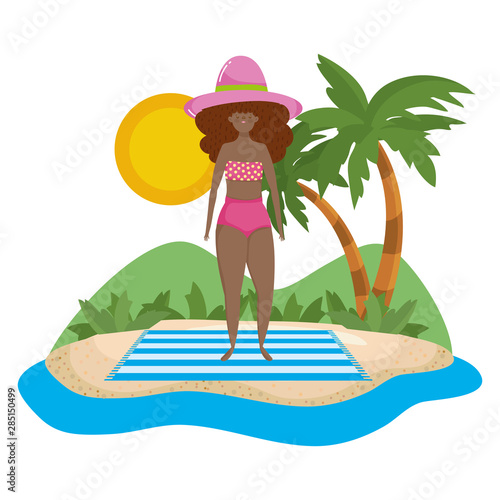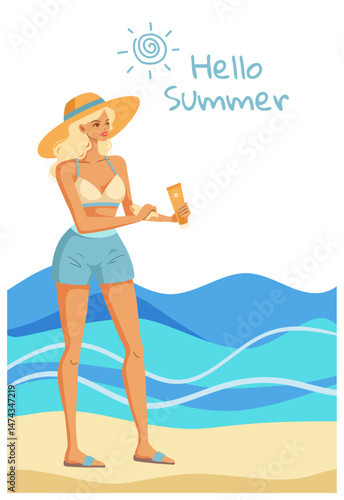 Vektorová ilustrace ženy v plavkách a sluneční čepici relaxující u moře. Dovolená na pláži šablona v retro pop art komické stylu.