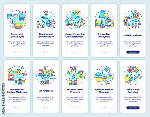 Vektor webové stránky lineární umění onboarding obrazovky šablony. Budoucí technologie. Komunikace mozku s ai, solární zdroje energie, zemědělství a biologie. Bannery nabídky pro vývoj webových stránek a mobilních aplikací