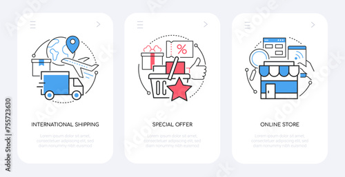 Vektorové webové stránky lineární umění onboarding obrazovky šablony. E-mailový marketing, spam, filtr, otevřená sazba. Bannery Menu pro vývoj webových stránek a mobilních aplikací. Moderní design ploché ilustrace