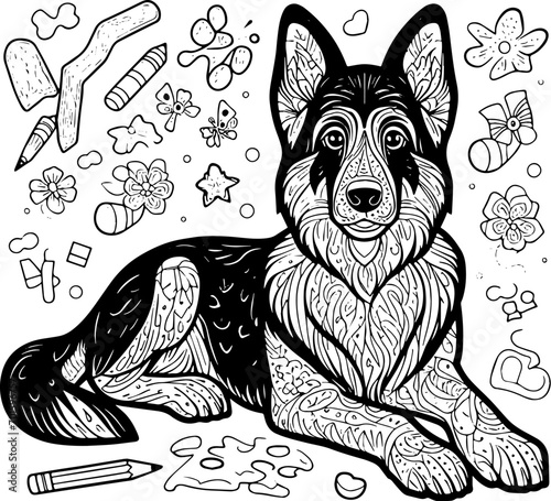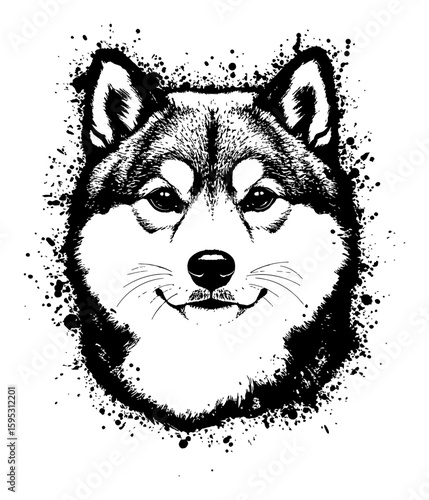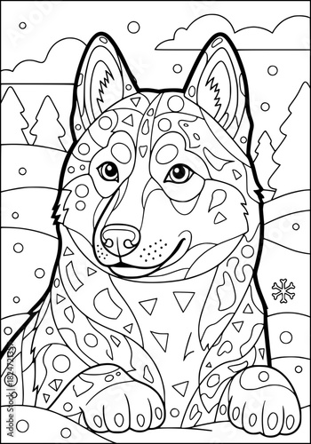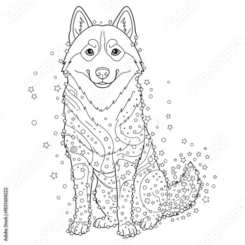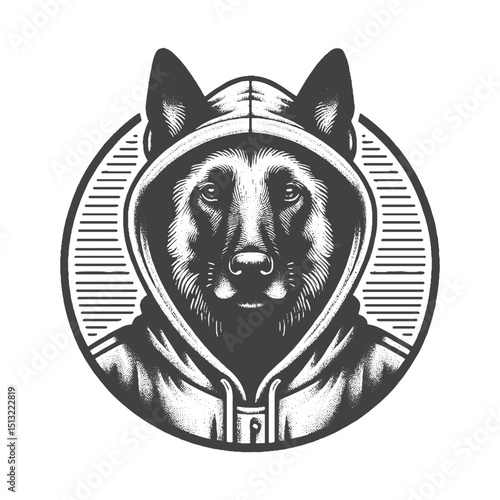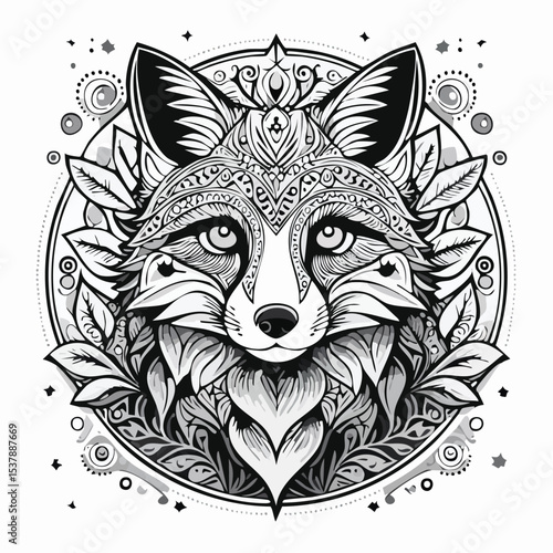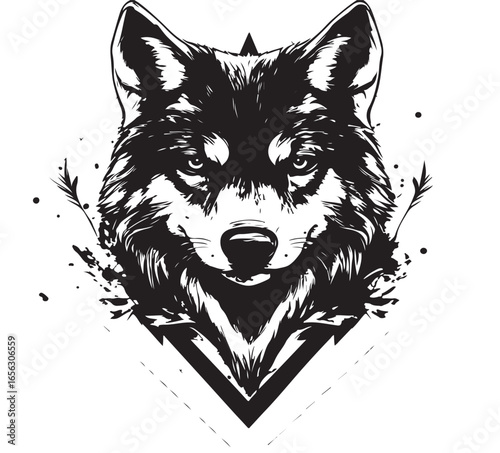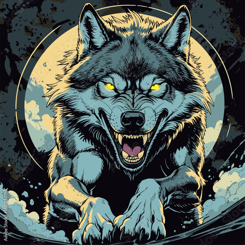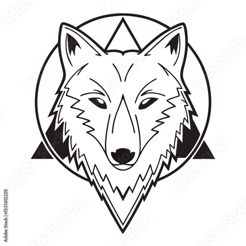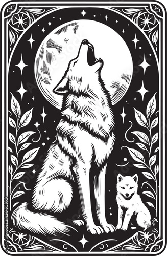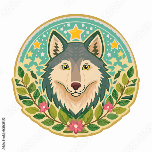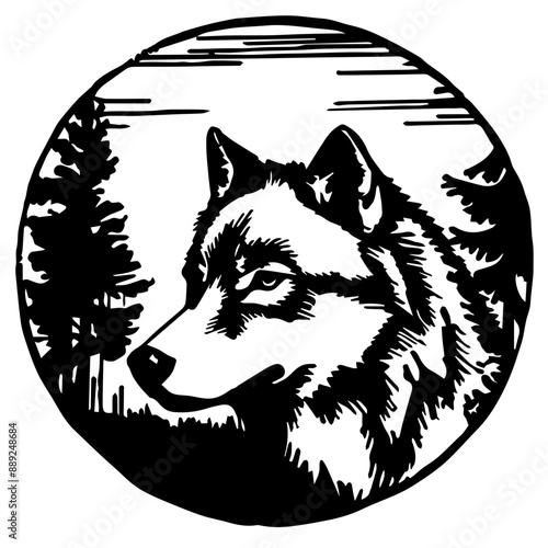 Vektorové zvířecí tetování nebo potisk trička. Vlčí hlava v kombinaci s přírodou v kulatém rámu s fázemi měsíce.