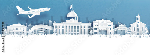 Benátky Cestování vektorové ilustrace. Itálie město slavný orientační bod, gondola loď, vintage Architektura vyhlídkové pozadí v papíru cut art stylu. Origami dědictví budovy a letadlo