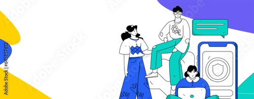 Veterinární klinika služby, vektorové ploché ilustrace. Obrovský pes a kočka, drobné postavy veterináři s injekční stříkačkou, mikroskopem, lupou. Veterinární prohlídka zvířat, ošetření zvířat, lékařská péče o zvířata.