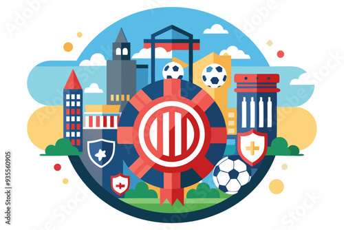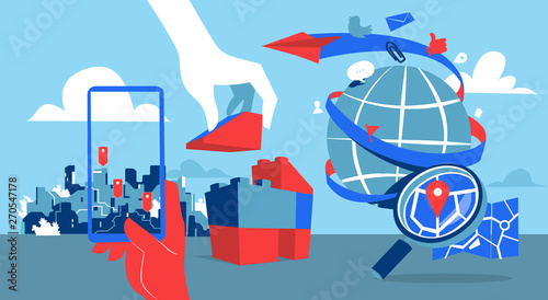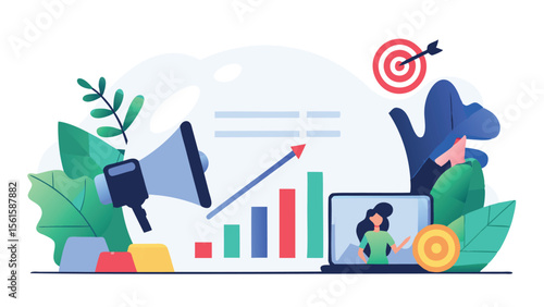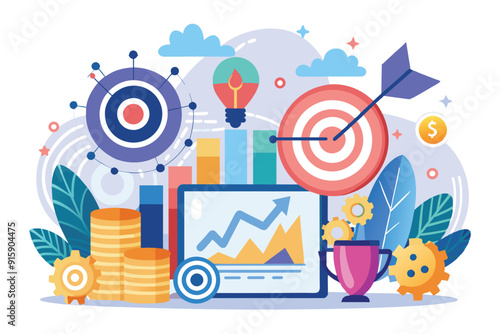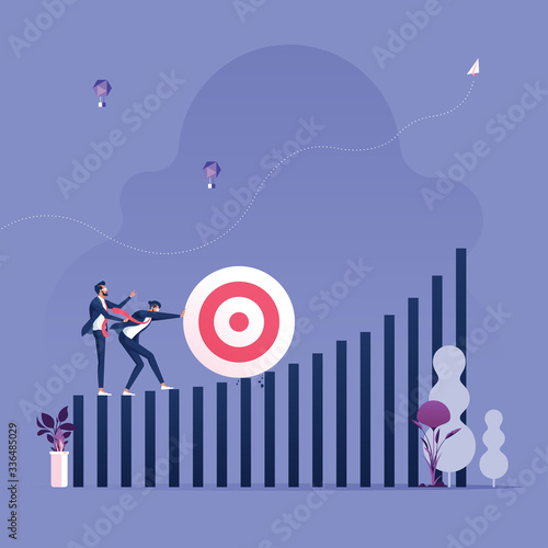 Podnikatel vůdce s obrovským cílem a jeho úspěšný tým, vector flat style design ilustrace. Vítězství, dosažení cíle, dosažení cíle, úspěch obchodního týmu, cílení.