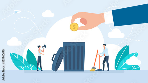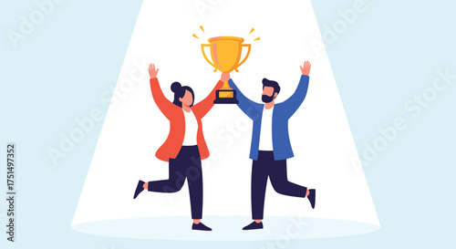 Obchodní hrdina vůdce s hvězdou a jeho tým slaví vítězství, vektorový plochý styl designu ilustrace. Dosažení cíle, úspěch obchodního týmu.