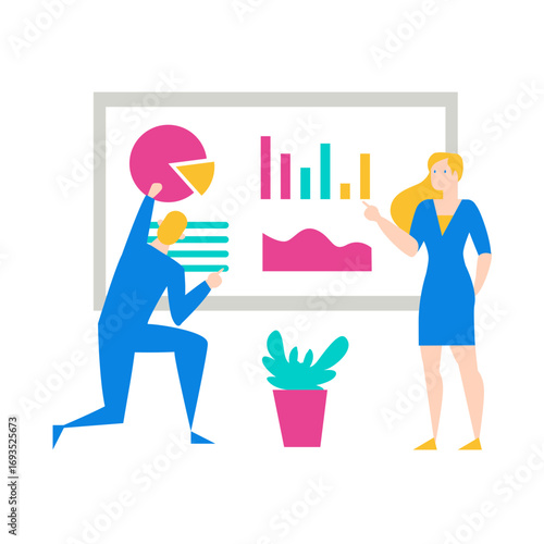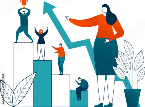 Obchodní hrdina vůdce s hvězdou a jeho tým slaví vítězství, vektorový plochý styl designu ilustrace. Dosažení cíle, úspěch obchodního týmu.