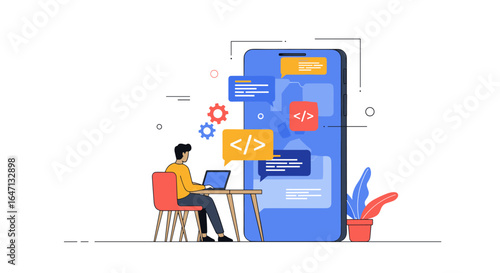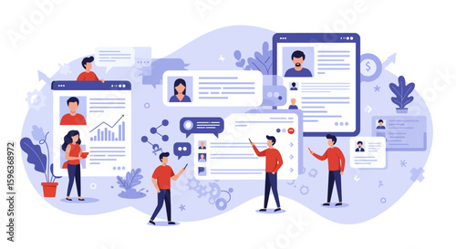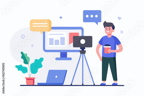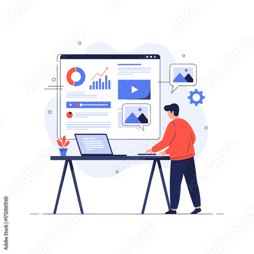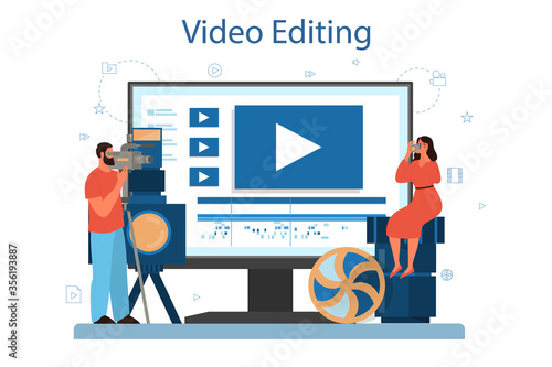Video obsah marketing vektorový koncept ilustrace. Obrovský tablet se symbolem přehrávání videa na obrazovce a mikro lidmi, kteří dávají lajky, komentáře atd. Propagace digitálního obsahu, videoreklama.