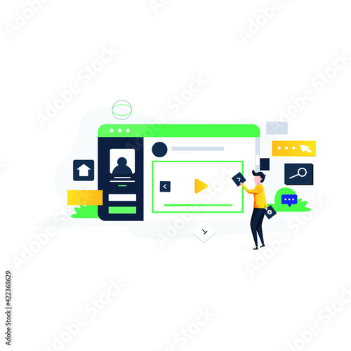Šablona webových stránek vektorového obsahu videa, návrh webových stránek a vstupních stránek pro vývoj webových stránek a mobilních stránek. Žurnalistika, koncepty video marketingu.