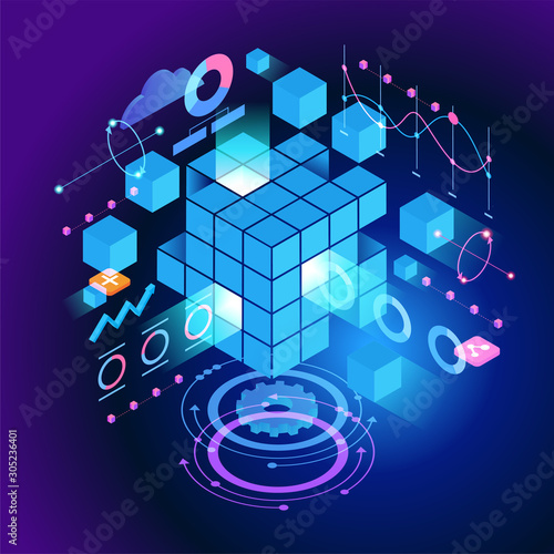 Video hra NFT vektor. Crypto token marketplace. Nezaměnitelný koncept technologie aktiv a blockchainu. Gamepad a futuristický design tech block