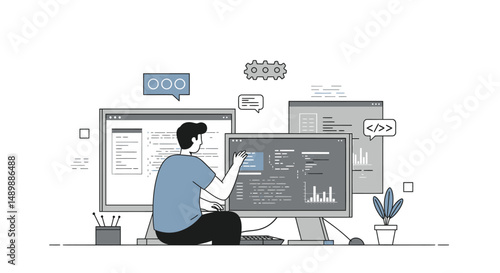 E-sportovní turnaj, vektorové ilustrace. Dva profesionální hráči hrající online videohru před obrazovkami počítače. Cybersport, konkurenční hry, Tým esports.