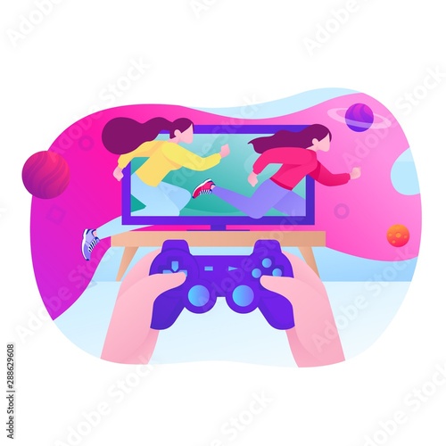 Obrovský herní ovladač pro herní konzoli, mikro mužské a ženské postavy, vektorové ilustrace. Koncept technologií videoher pro webový banner, webovou stránku atd.