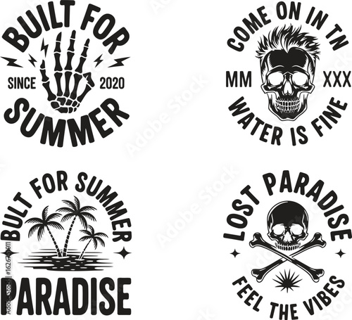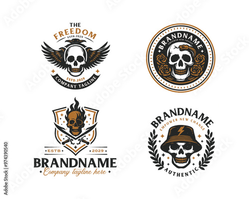 Vintage black Moto lebka štítky, loga, emblémy, odznaky vektorové ilustrace izolovaných na bílém pozadí. Moto klub, opravy motocyklů a motocyklový servis typografický design.