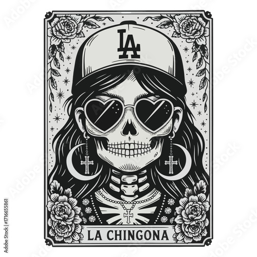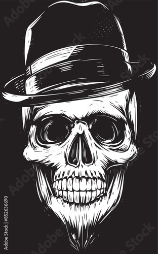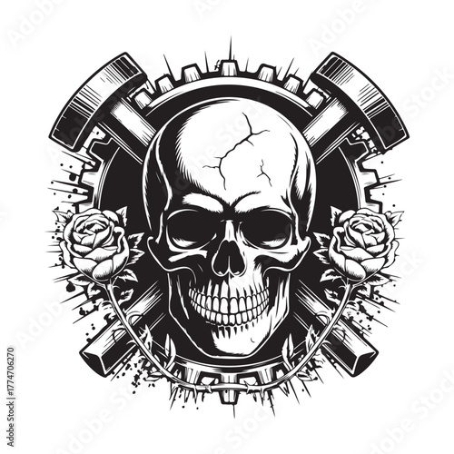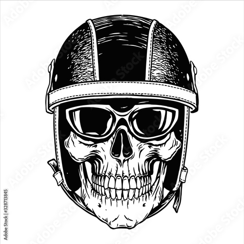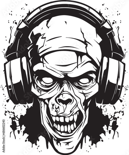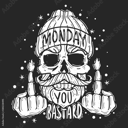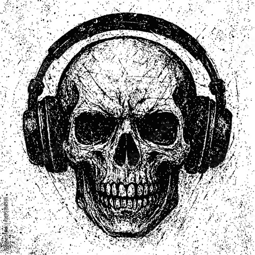 Rocková hvězda vintage grunge design pro tričko. Vektorové ručně kreslené ilustrace plešatý lebky s knírem, vousy a ďábel rohy poslechu hudby.