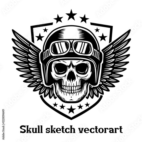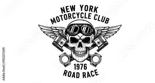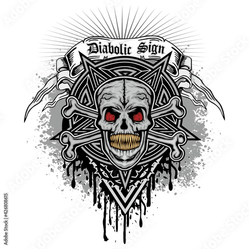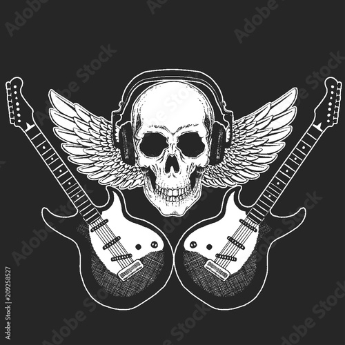 Rocková hvězda vintage grunge design pro tričko. Vektorové ručně kreslené ilustrace kytary, reproduktorů, roztažených křídel a plešaté lebky s ďáblovými rohy poslouchajícími hudbu.