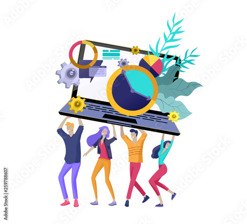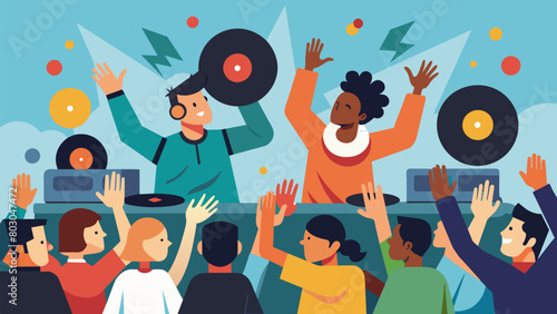 Obrovský vintage gramofon s vinylovou deskou a mikro mužskými a ženskými postavami, které poslouchají starou retro hudbu a tanec, vektorová ilustrace. Starověký koncept hudební techniky pro webový banner, webová stránka.