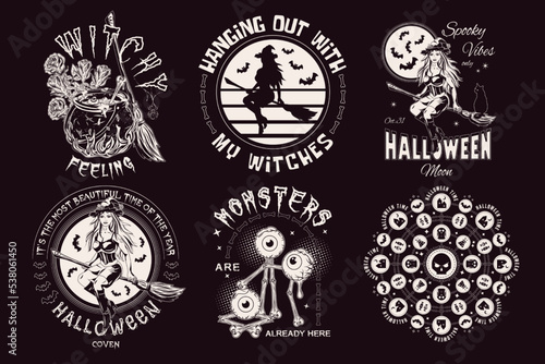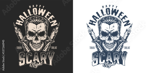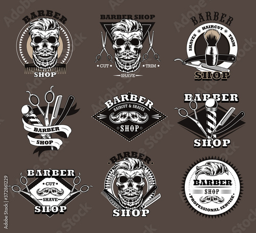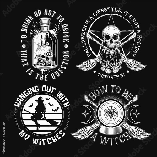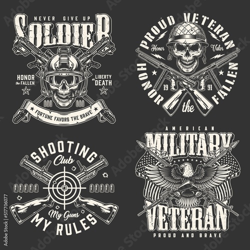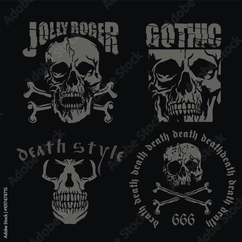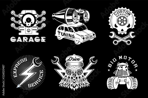 Vintage white Moto lebka loga, emblémy, odznaky a štítky, vektorové ilustrace izolovaných na černém pozadí. Motocykl, motorkářské lebky v helmě, brýle a šátek na obličej, nástroje na opravu, text.