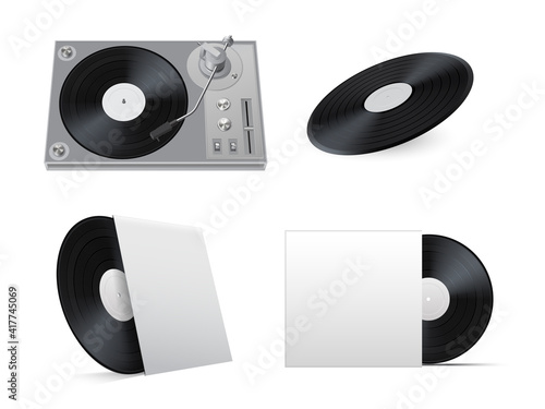 Vinylová deska s prázdným bílým krytem izolované vektorové sady. Hudba gramofon LP záznam disk s papírovým pouzdrem kryt maketa 3D design jiný úhel pohledu