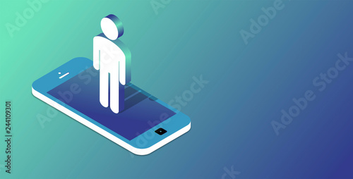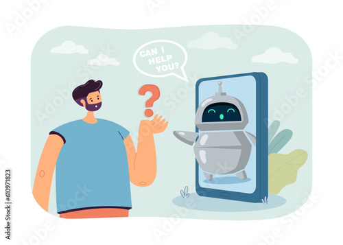 Virtuální pomoc vektorové koncepce ilustrace. Izometrický smartphone s robotickým virtuálním asistentem nebo chatbotem komunikujícím s lidským mužem. Osobní asistent mobilní aplikace.
