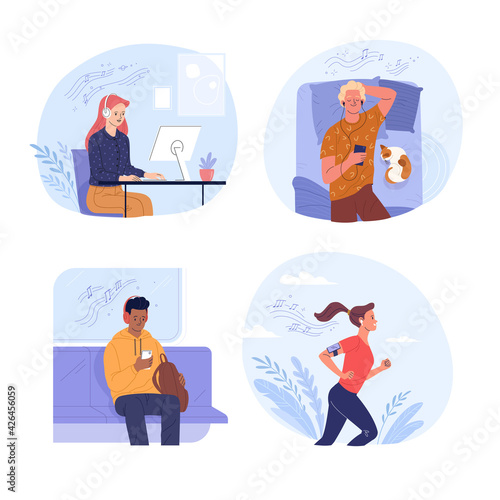 Virtuální realita set vektorové ploché ilustrace. Lidé ve VR náhlavních soupravách interagují s grafy, hrají vr hry, řídí závodní auto, bojují s rytířem, létají ve vesmíru. Technologie virtuální reality.