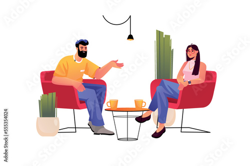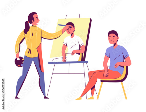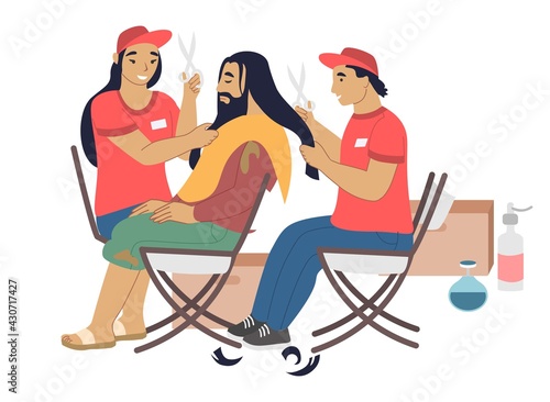 Dobrovolníci holiči stříhání vlasů bezdomovce, ploché vektorové ilustrace. Péče o bezdomovce, dobrovolnictví a charita.