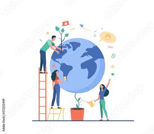 Dobrovolníci čištění planety Země zeměkoule sbírání odpadků, zalévání rostlin, ploché vektorové ilustrace. Zachraňte planetu, životní prostředí, ekologii, ochranu přírody.