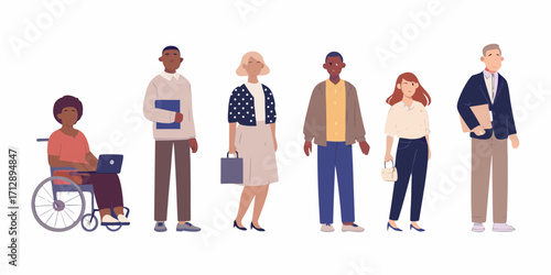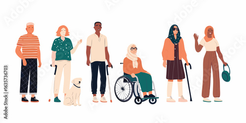 Dobrovolníci pomáhající lidem se zdravotním postižením. Rozmanitost cocenpt vektorové ilustrace. Skupina lidí se speciálními potřebami, invalidní vozík, protéza.