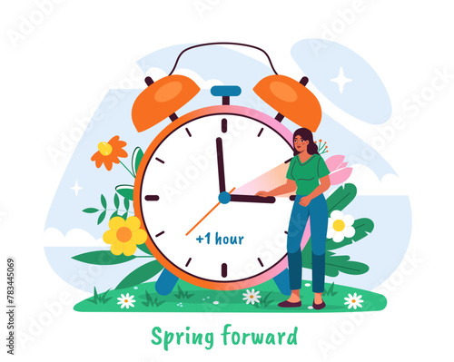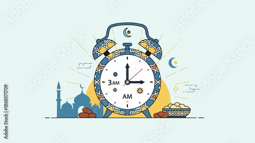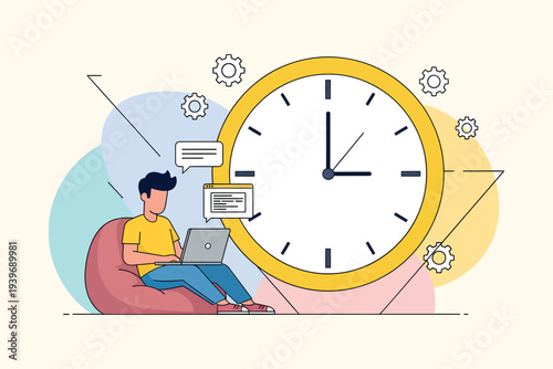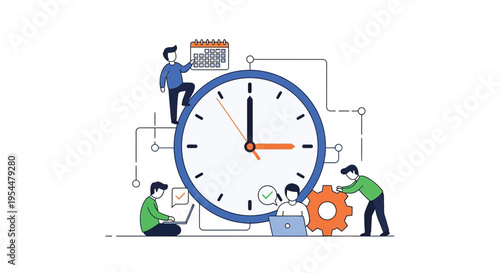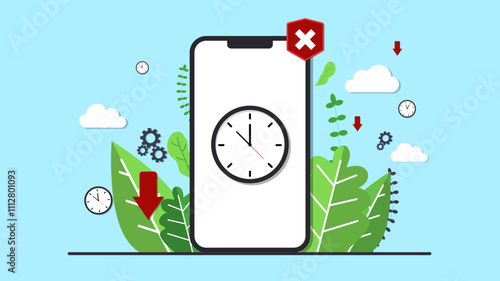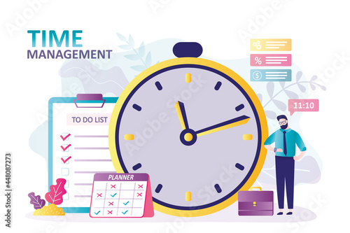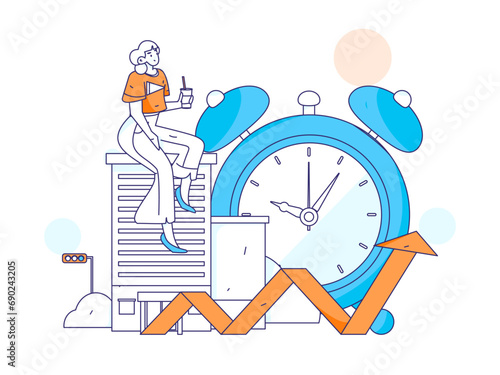 Budík, drobné postavy spící, probuzení, pití kávy, vektorová plochá ilustrace. Budík připomenutí mobilní telefon app. Kancelářská aktivita a připomenutí přerušení, probuzení alarmů a časovače spánku.