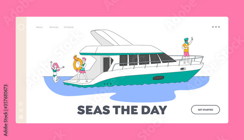 Wakeboarding vektorové webové stránky šablony, webové stránky a vstupní stránky design pro webové stránky a mobilní vývoj webu. Motorový člun a wakeboardista stojící na wakeboardu. Letní plážová aktivita, wakeboardový sport.