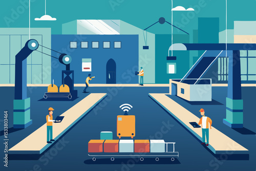 Denní aktivita skladového týmu, plochá vektorová ilustrace. Nakladače, vedoucí skladu, skladovatel zabývající se prací. Příjem, přeprava a skladování zboží.