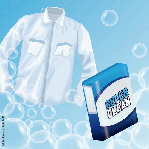 Prací prášek vektorové reklamy. Čistič na špinavé prádlo s novou reklamou na aktivní kyslík. Obal balení s realistickým designem pro propagaci značky