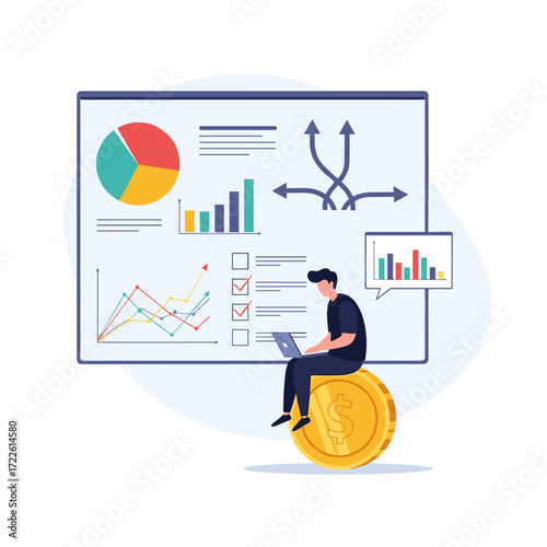 Muž dobrovolník sbírání odpadků, uvedení prázdnou krabici na pizzu do pytle na odpadky, vektorové ploché ilustrace izolované na bílém pozadí. Sběr a třídění papírového odpadu k recyklaci, čištění ulic.