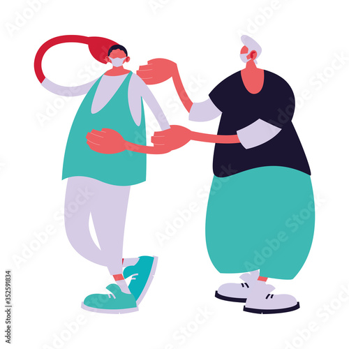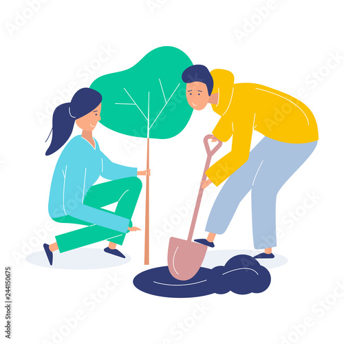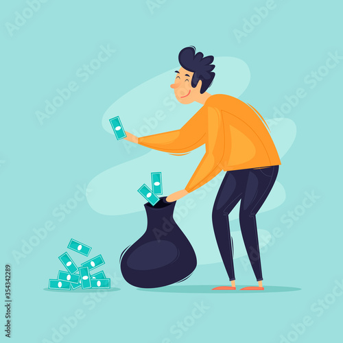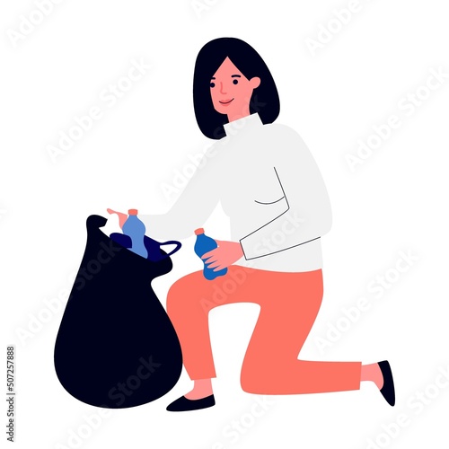 Žena dobrovolník uvedení prázdnou lepenkovou krabici do pytle na odpadky, vektorové ploché ilustrace izolované na bílém pozadí. Sběr a třídění odpadů pro recyklaci, čištění ulic, dobrovolnictví.