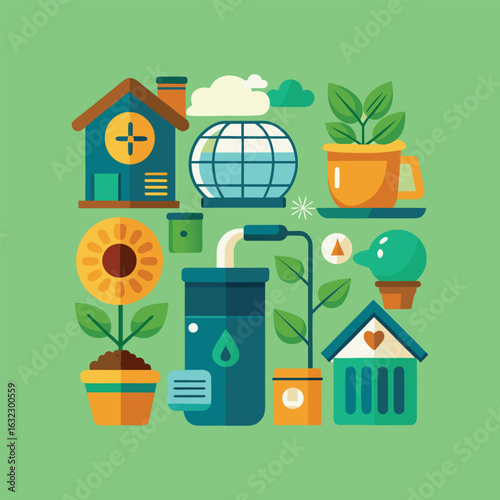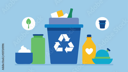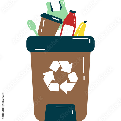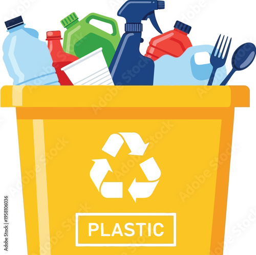 Třídění odpadu z plastů vektorové ploché designové ilustrace. Oranžový kontejner na odpadky se symbolem recyklace, prázdné plastové lahve, kontejnery. Ekologie a recyklace koncept pro web banner, webové stránky.