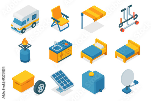 Třídění odpadu a recyklace proces izometrické ikona set, vektorové ilustrace izolovaných na bílém pozadí. Zařízení na recyklaci odpadu, zařízení, odpadkový vůz a plechovky, plastový papírový skleněný domácí odpad.