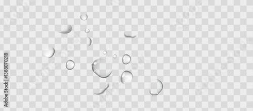Kapka vody, kapka deště, vektor kapalných bublin. Mokrý povrch a dešťová kapka na průhledném pozadí. Realistický svěží a jasný makro aqua drip shape Bezešvý design