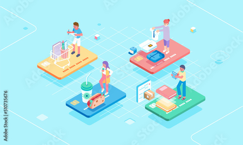 Vodní park vektor izometrická infografika s různými typy skluzavek, bazény, ruské kolo, vířivá vana, fontány, relaxační a dětské prostory. Infografika konceptu Aqua parku.