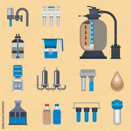 Proces čištění vody krok vektorové ilustrace. Schéma čištění odpadních vod, mořské vody nebo pitné kapaliny. Design reklamy a infografiky