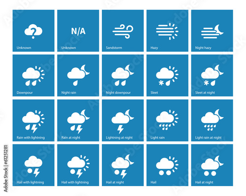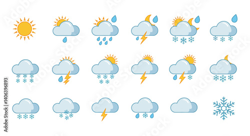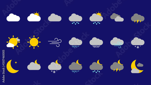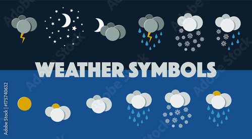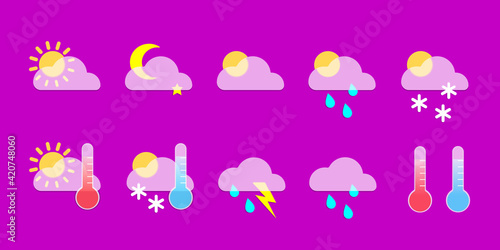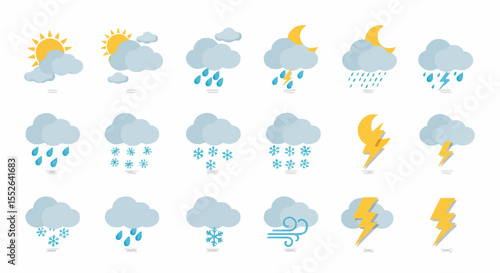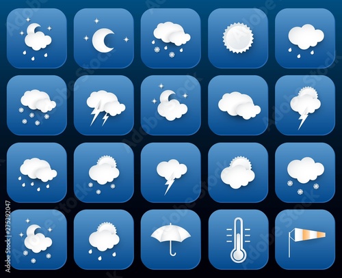 Předpověď počasí ikona set, vektorové ilustrace v papírové umění moderní řemeslné stylu. Slunečno, částečně slunečno, zataženo, většinou Zataženo, déšť, sníh, bouřky, blesky atd.